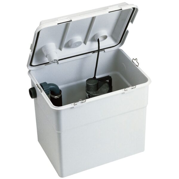 Pumping station for the collection and lifting of domestic waste water from the bath, sink, shower, and washing machine in basements, or below the sewer network in general.
